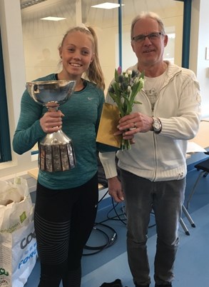 Tilde Johansson, Falkenbergs IK, mottog priset som Årets Halländska friidrottare av Johnny Lingstam, ordförande HFIF.
